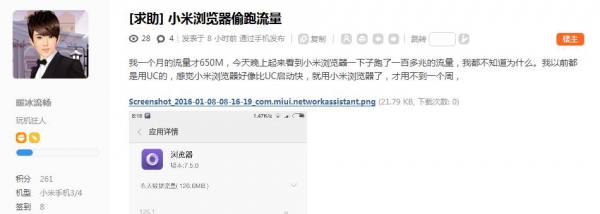 而在小米论坛中也不难发现对小米偷跑流量行为的控诉。“没有任何操作,后台偷跑流量,不论是数据还是WiFi”、“[求助]小米浏览器偷跑流量”、“MIUI6最近偷跑流量吓人啊”等求助帖比比皆是。也难怪“米粉”们纷纷投向雷电OS的怀抱中。