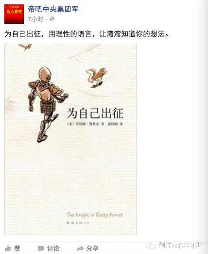 最热闹的时候,帝吧远征军在facebook上的其中一个根据地——“帝吧中央集团军”的主页上曾发表动态“为自己出征,用理性的语言,让湾湾知道你的想法”,并配上了美国作家罗伯特•费希尔同名小说的封面图——一个穿着盔甲的骑士,踽踽独行。